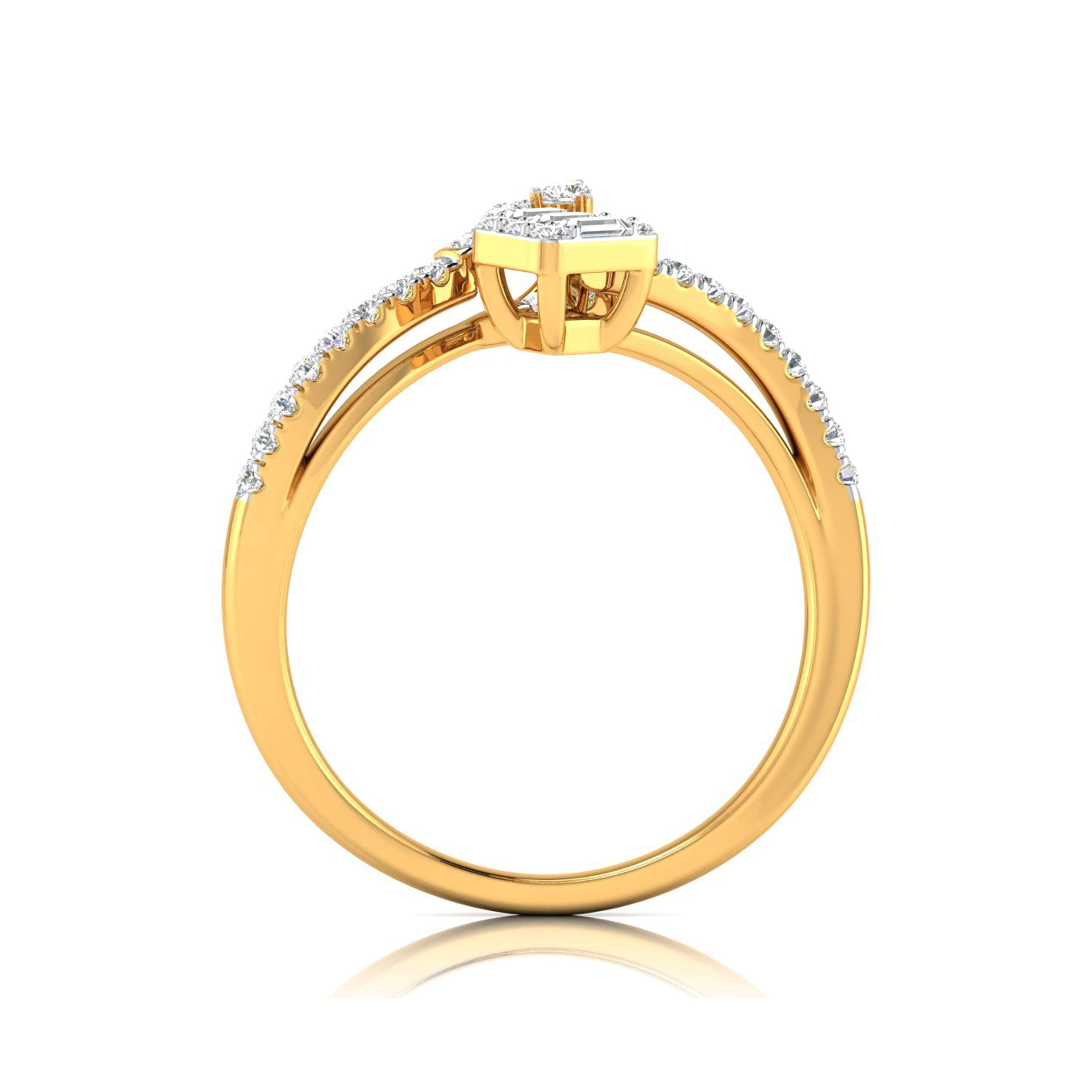 This exquisite ring blends modern design with timeless elegance, featuring a beautifully twisted band adorned with sparkling diamonds. One end of the ring showcases a stunning cluster of baguette-cut diamonds, while the other end forms a delicate swirl encrusted with round diamonds, adding a unique and luxurious touch. The combination of sleek lines and intricate detailing creates a bold yet graceful statement piece, perfect for those who appreciate artistic craftsmanship. Ideal for special occasions or adding a touch of sophistication to your everyday style.