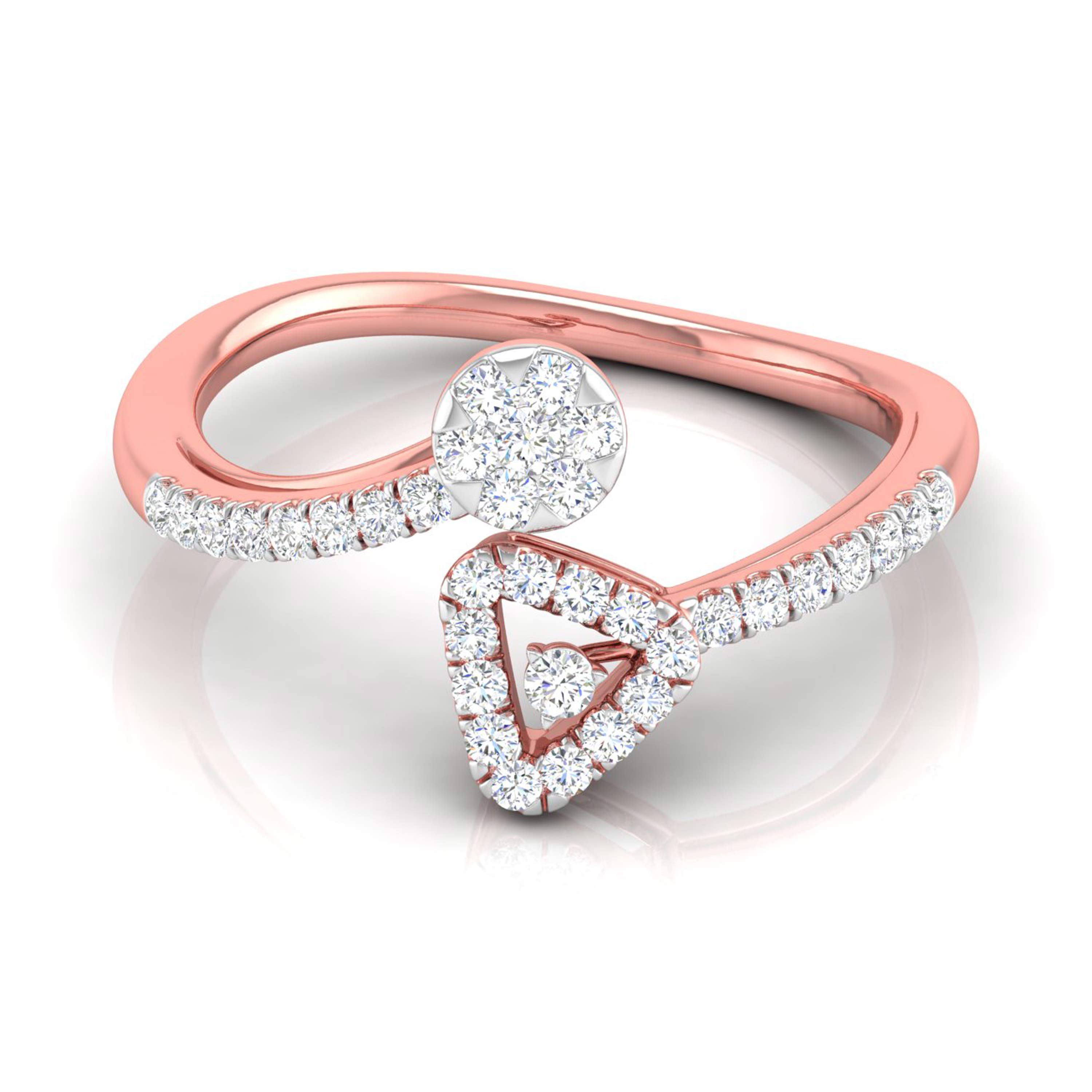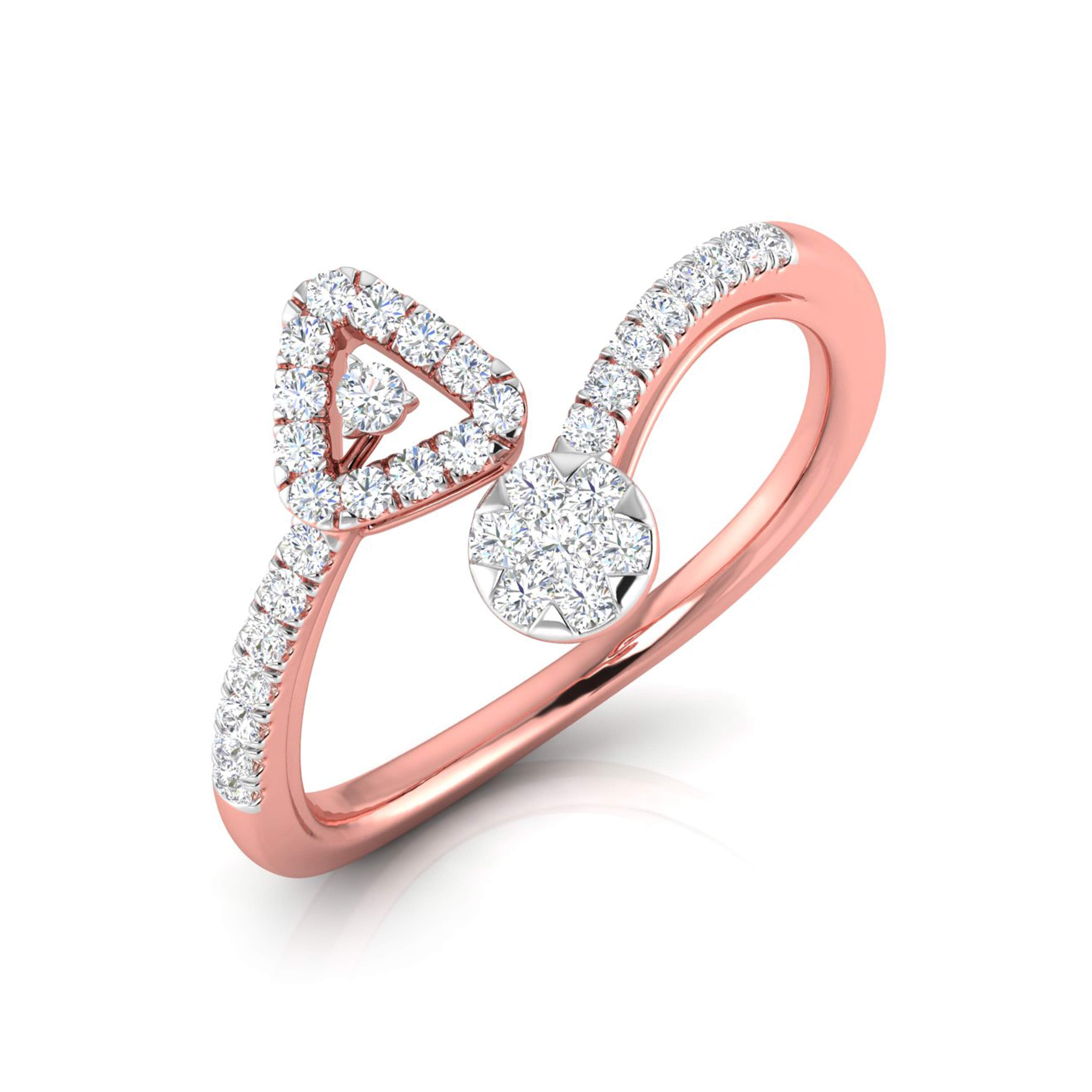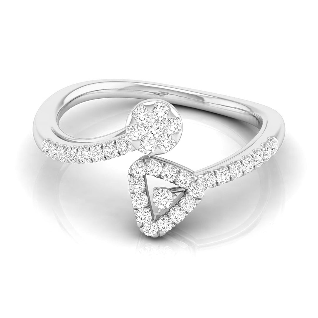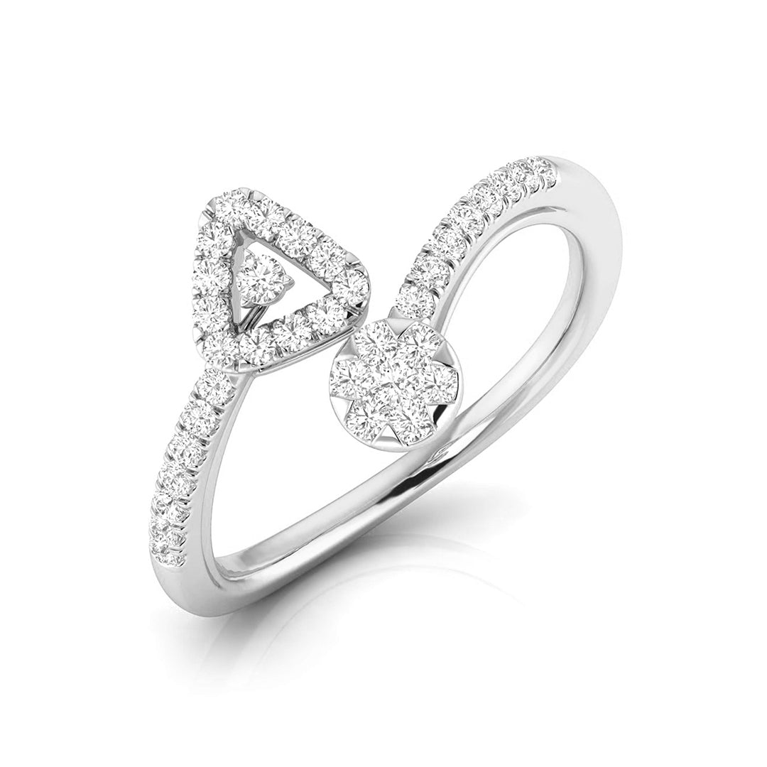 This captivating ring marries contemporary design with geometric flair, featuring a bold triangular frame on one side and a round, floral diamond cluster on the other. The band is gracefully adorned with sparkling diamonds, creating a beautiful balance between the two shapes. Ideal for those who appreciate modern artistry and distinctive elegance, this ring adds a touch of uniqueness to any jewelry collection. Perfect for making a statement or celebrating a special occasion, its harmonious design is both striking and timeless.
