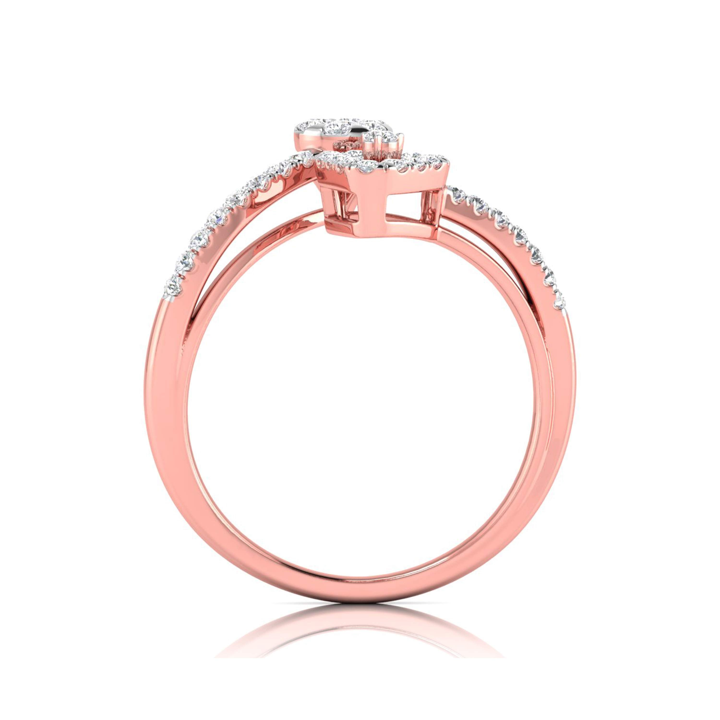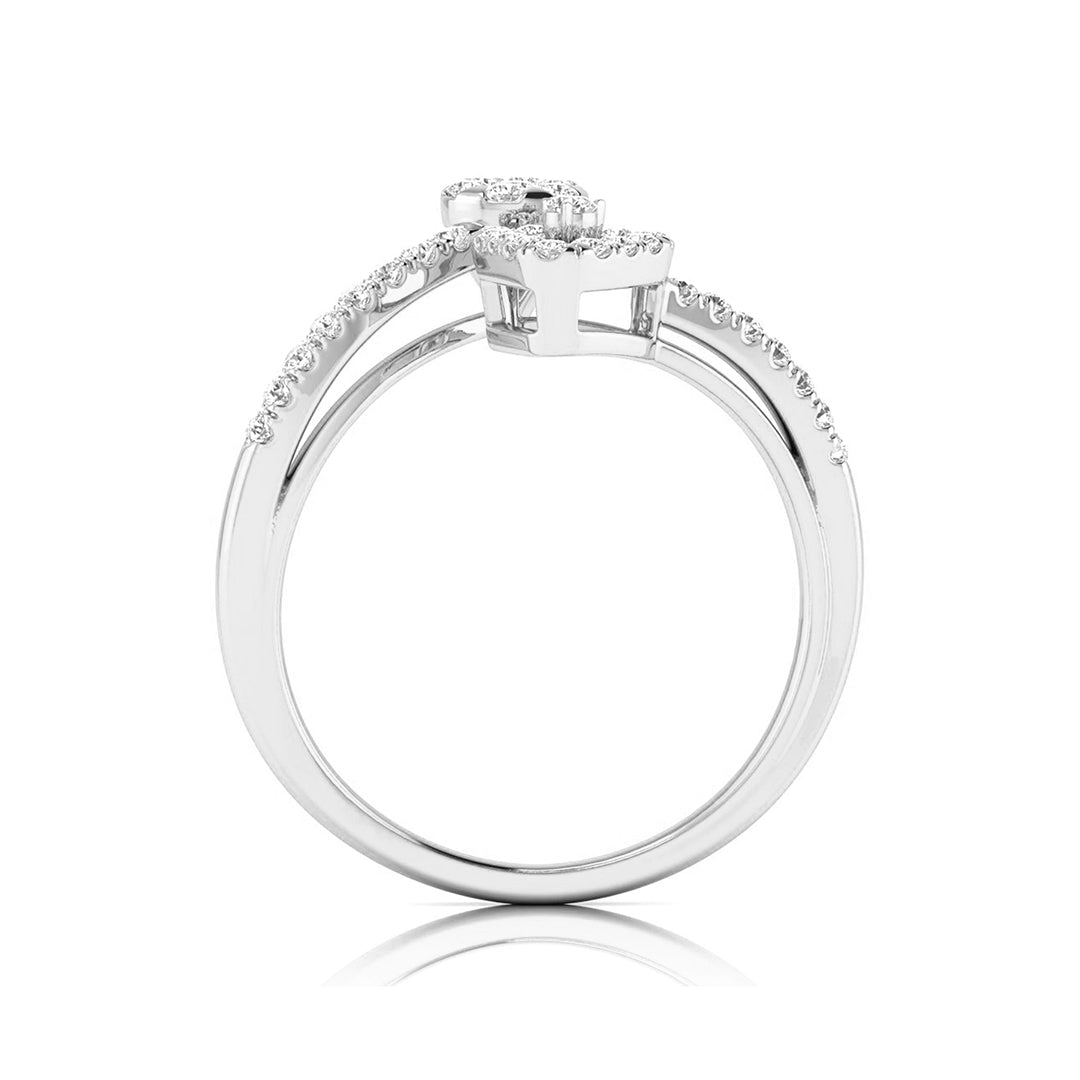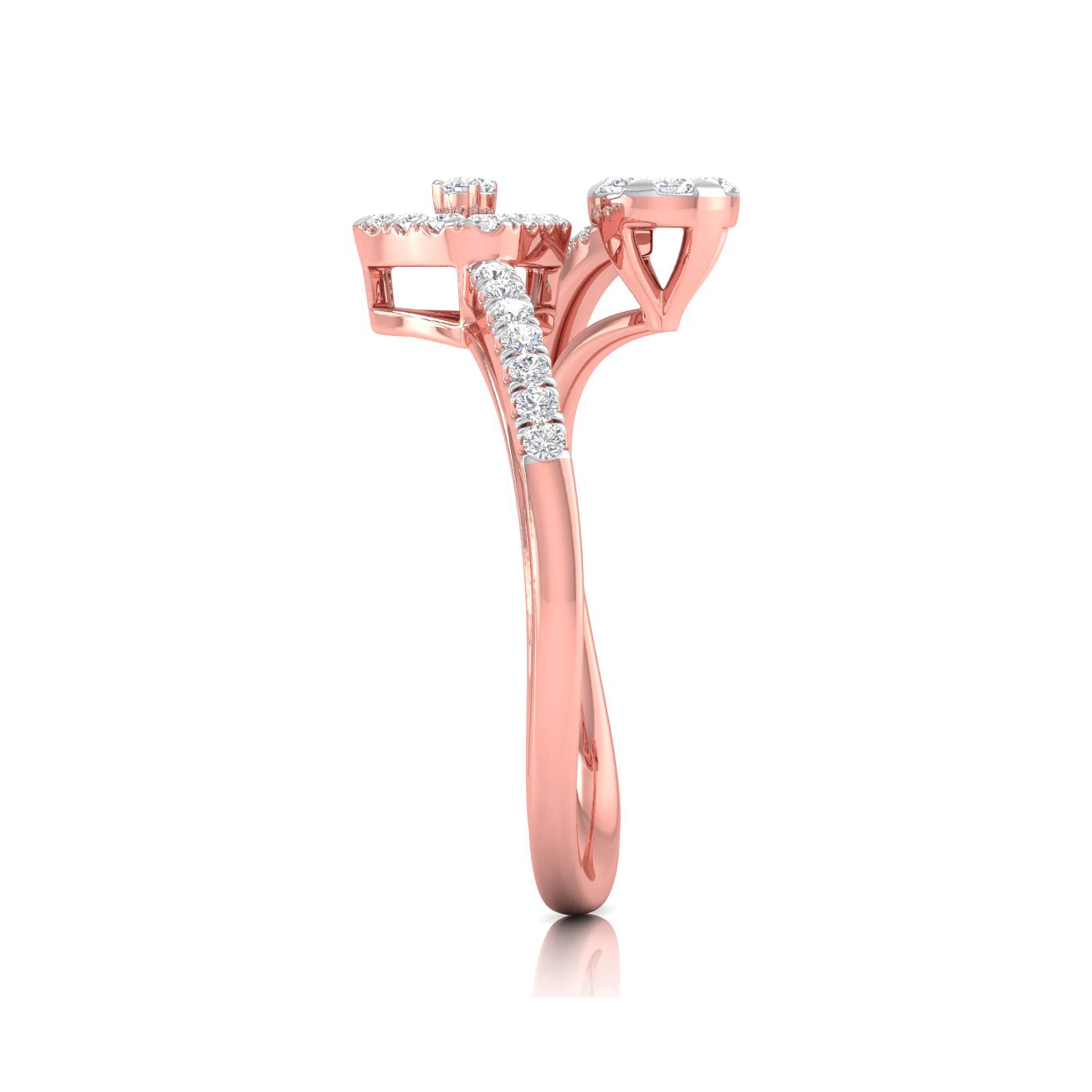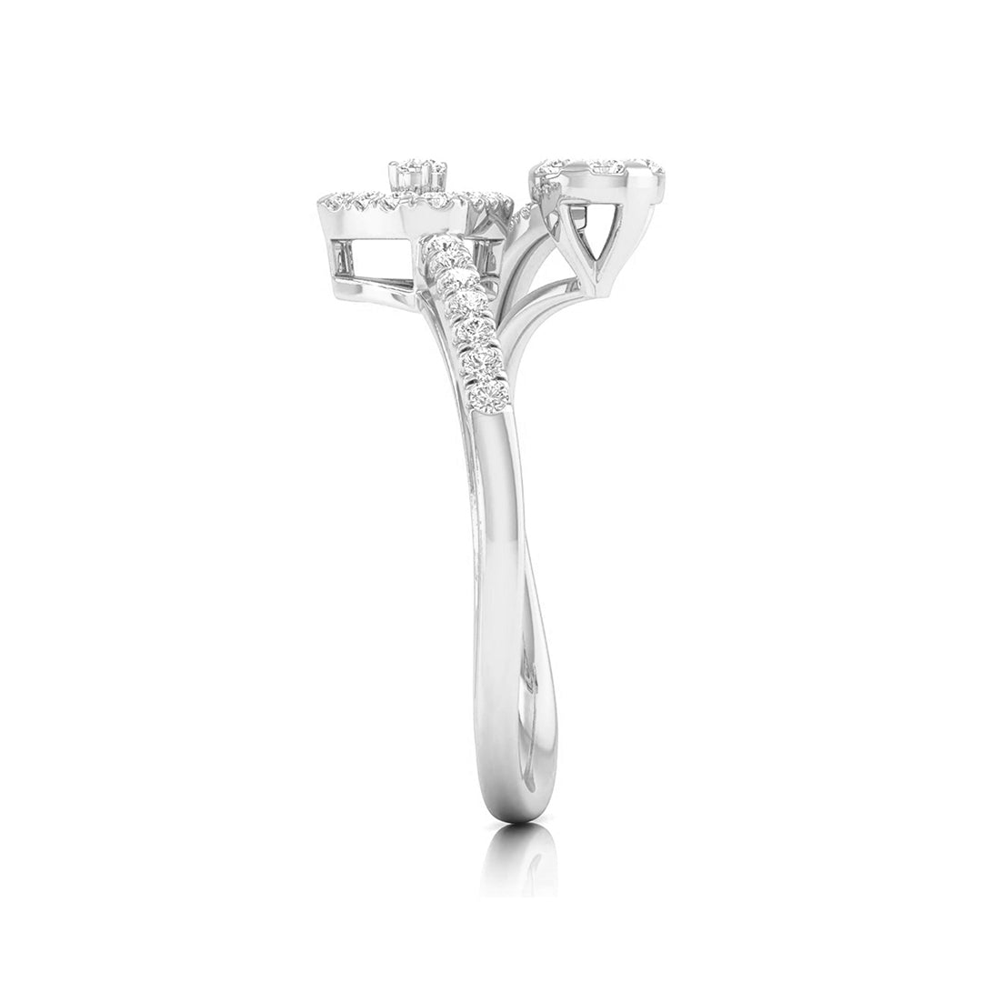 This captivating ring marries contemporary design with geometric flair, featuring a bold triangular frame on one side and a round, floral diamond cluster on the other. The band is gracefully adorned with sparkling diamonds, creating a beautiful balance between the two shapes. Ideal for those who appreciate modern artistry and distinctive elegance, this ring adds a touch of uniqueness to any jewelry collection. Perfect for making a statement or celebrating a special occasion, its harmonious design is both striking and timeless.