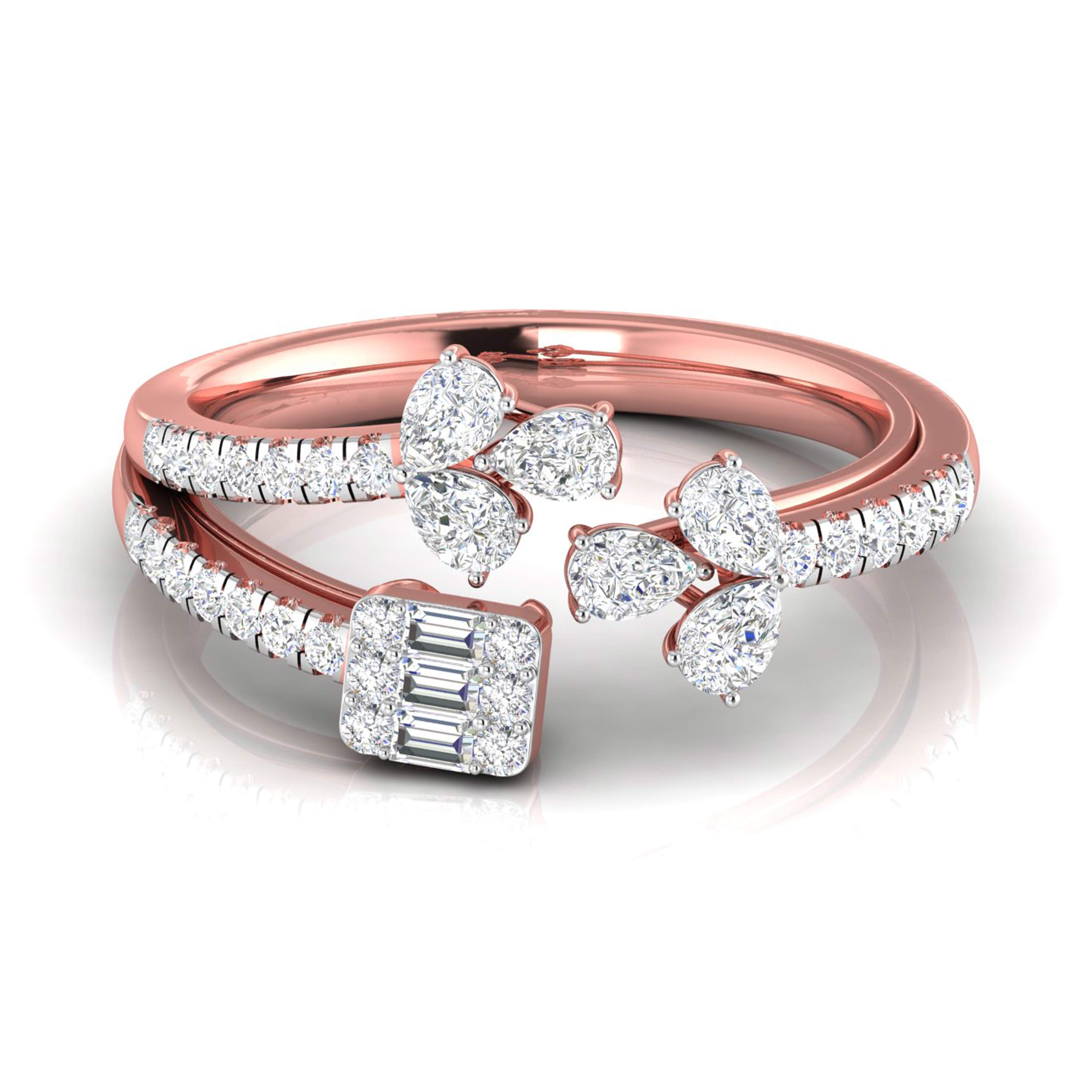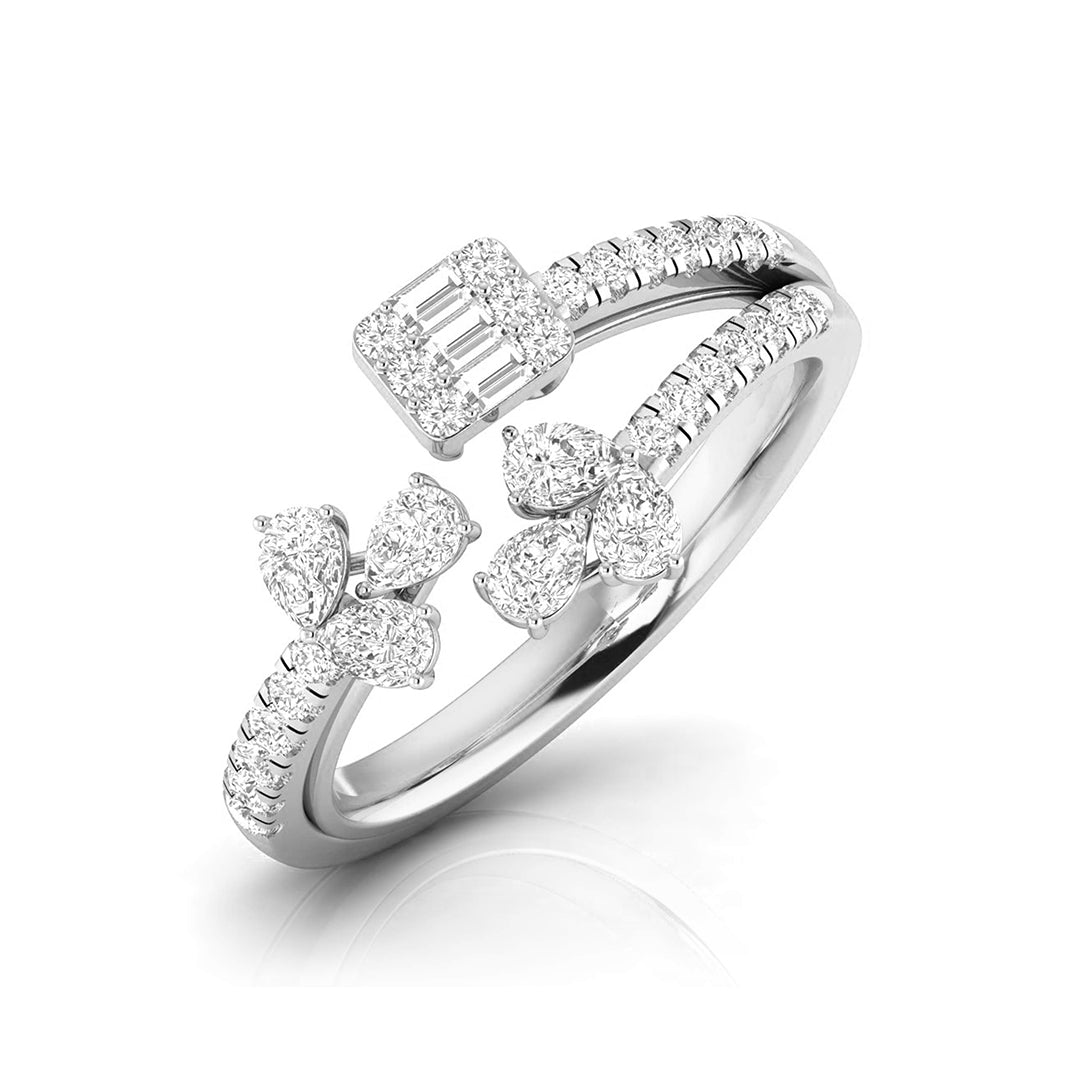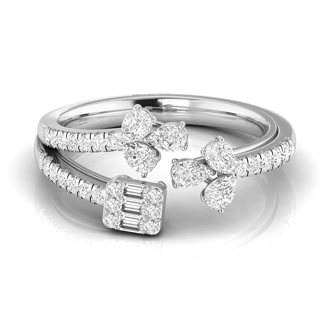 This stunning double-band ring captures the essence of elegance with a floral-inspired design on one side, featuring delicate pear-shaped diamonds arranged like petals, and a radiant baguette-cut diamond cluster on the other. The split-band, encrusted with shimmering diamonds, adds a sense of movement and grace to the piece. Perfect for those who appreciate both nature and modern sophistication, this ring is a statement of refined beauty. Whether worn for special occasions or to elevate your everyday style, it embodies timeless luxury with a fresh, artistic twist.