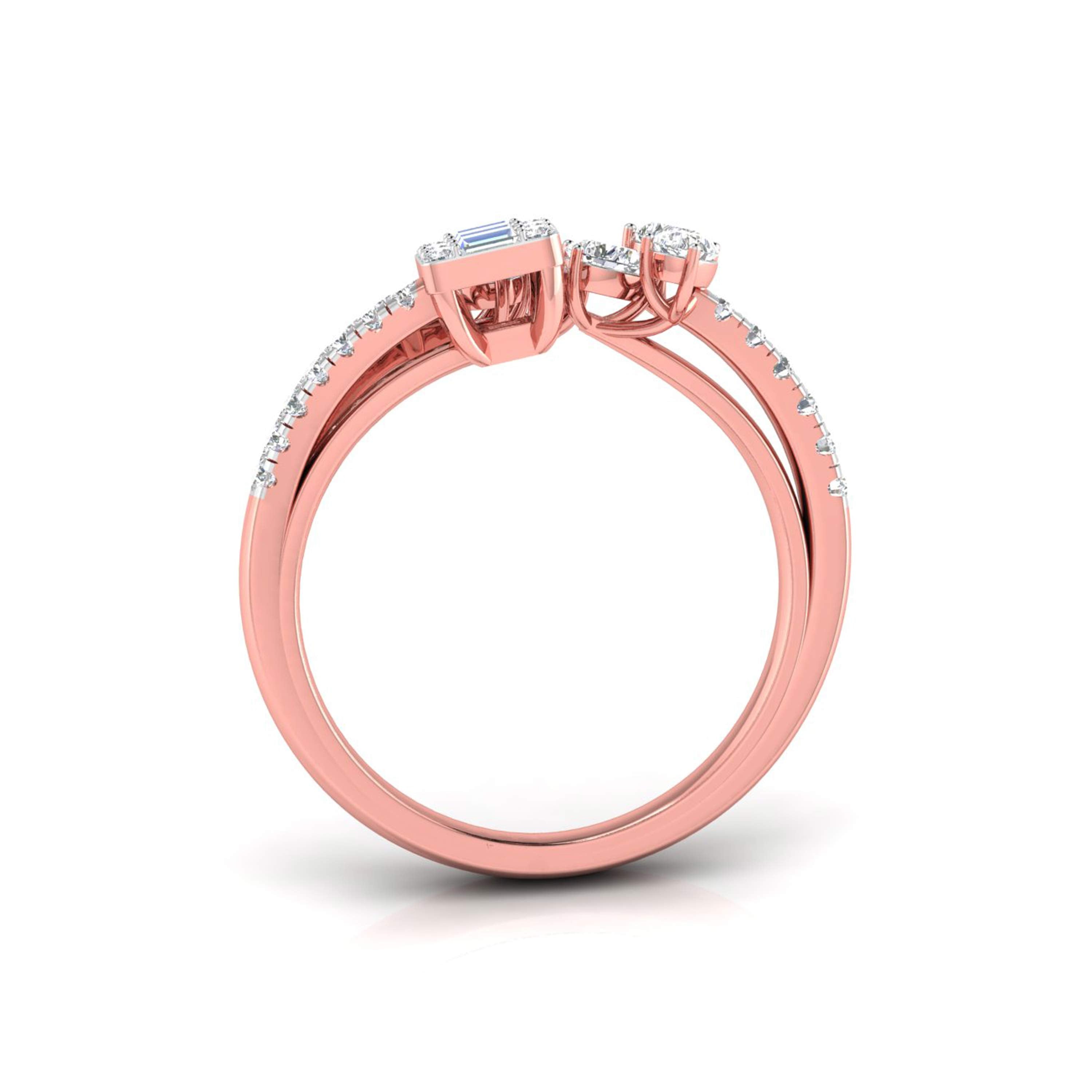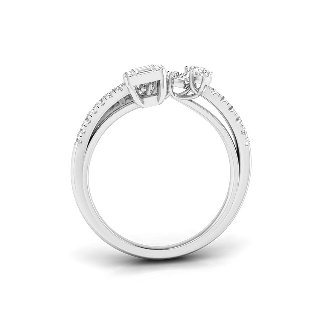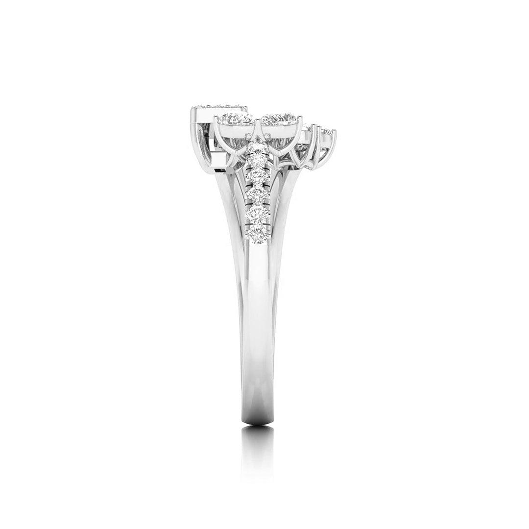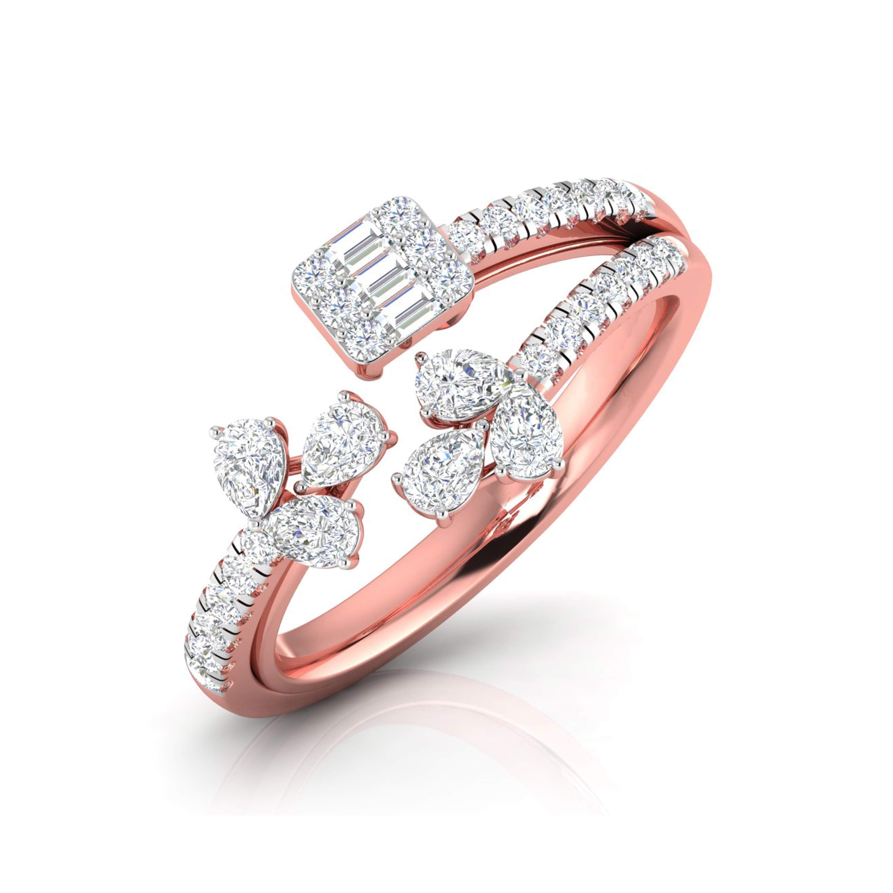 This stunning double-band ring captures the essence of elegance with a floral-inspired design on one side, featuring delicate pear-shaped diamonds arranged like petals, and a radiant baguette-cut diamond cluster on the other. The split-band, encrusted with shimmering diamonds, adds a sense of movement and grace to the piece. Perfect for those who appreciate both nature and modern sophistication, this ring is a statement of refined beauty. Whether worn for special occasions or to elevate your everyday style, it embodies timeless luxury with a fresh, artistic twist.