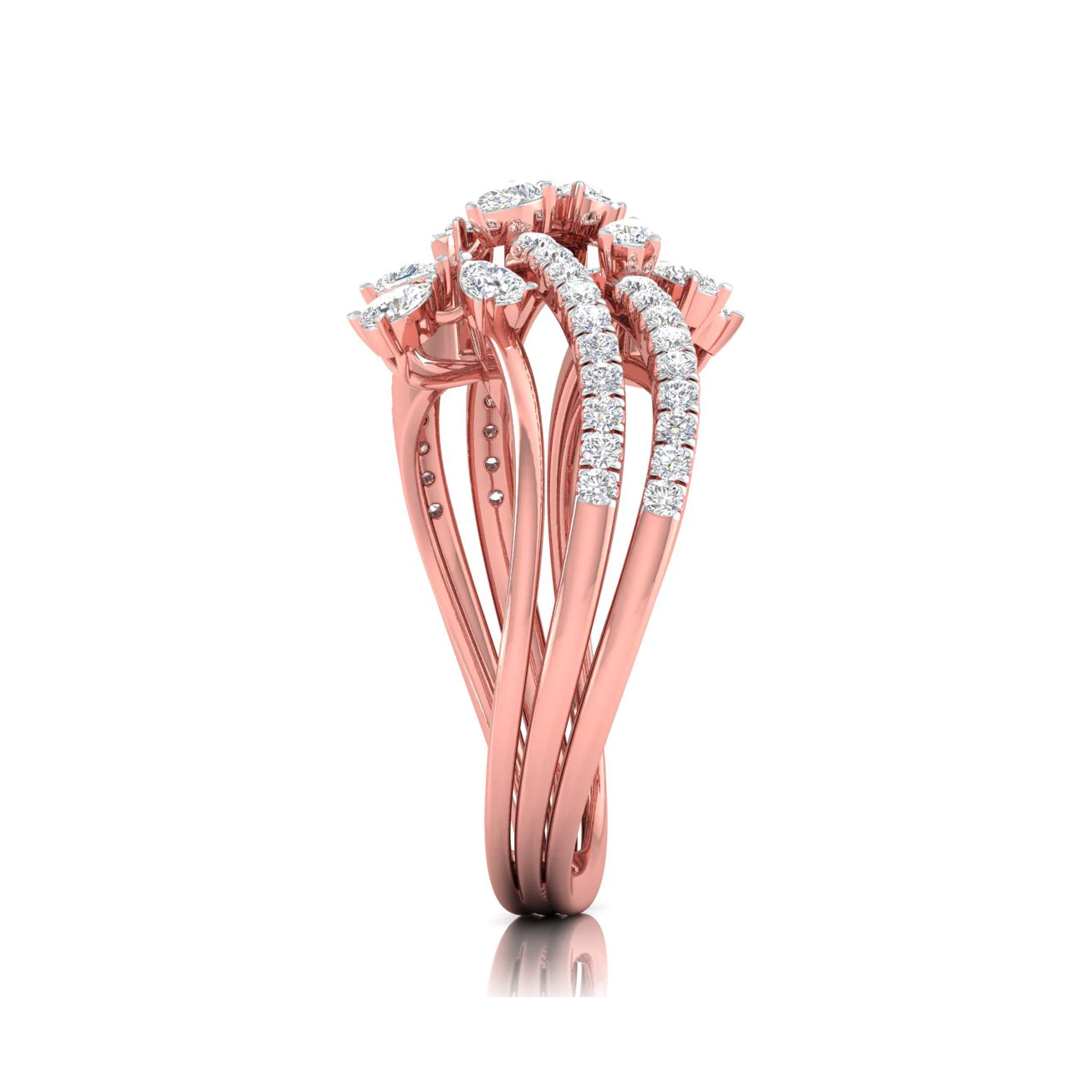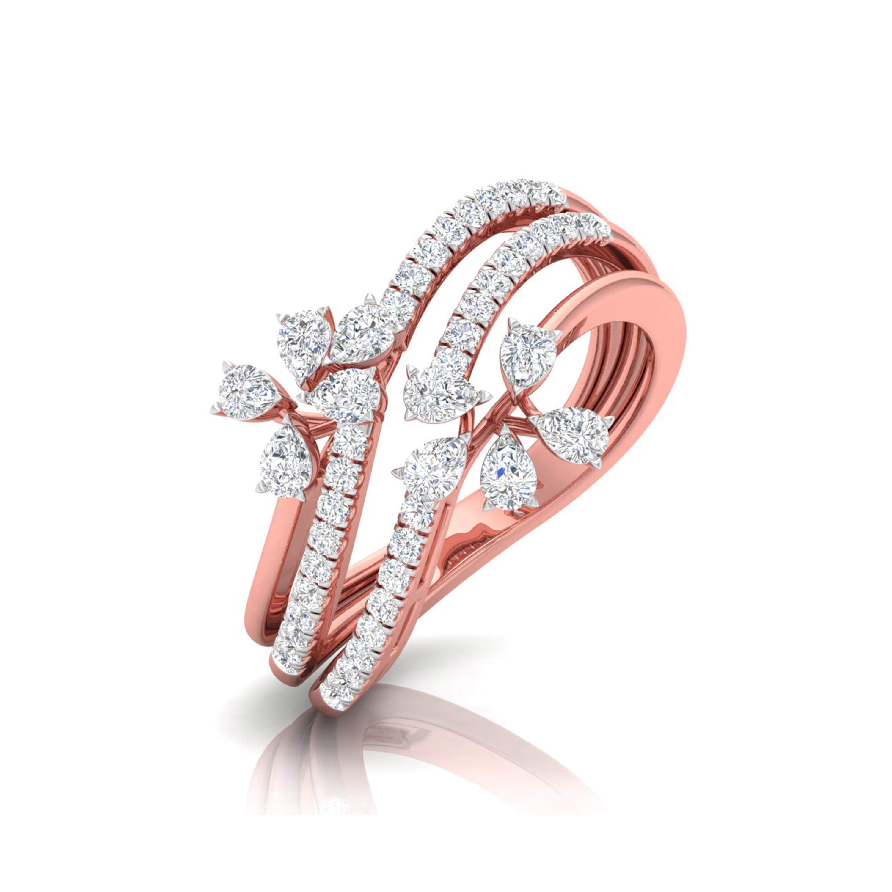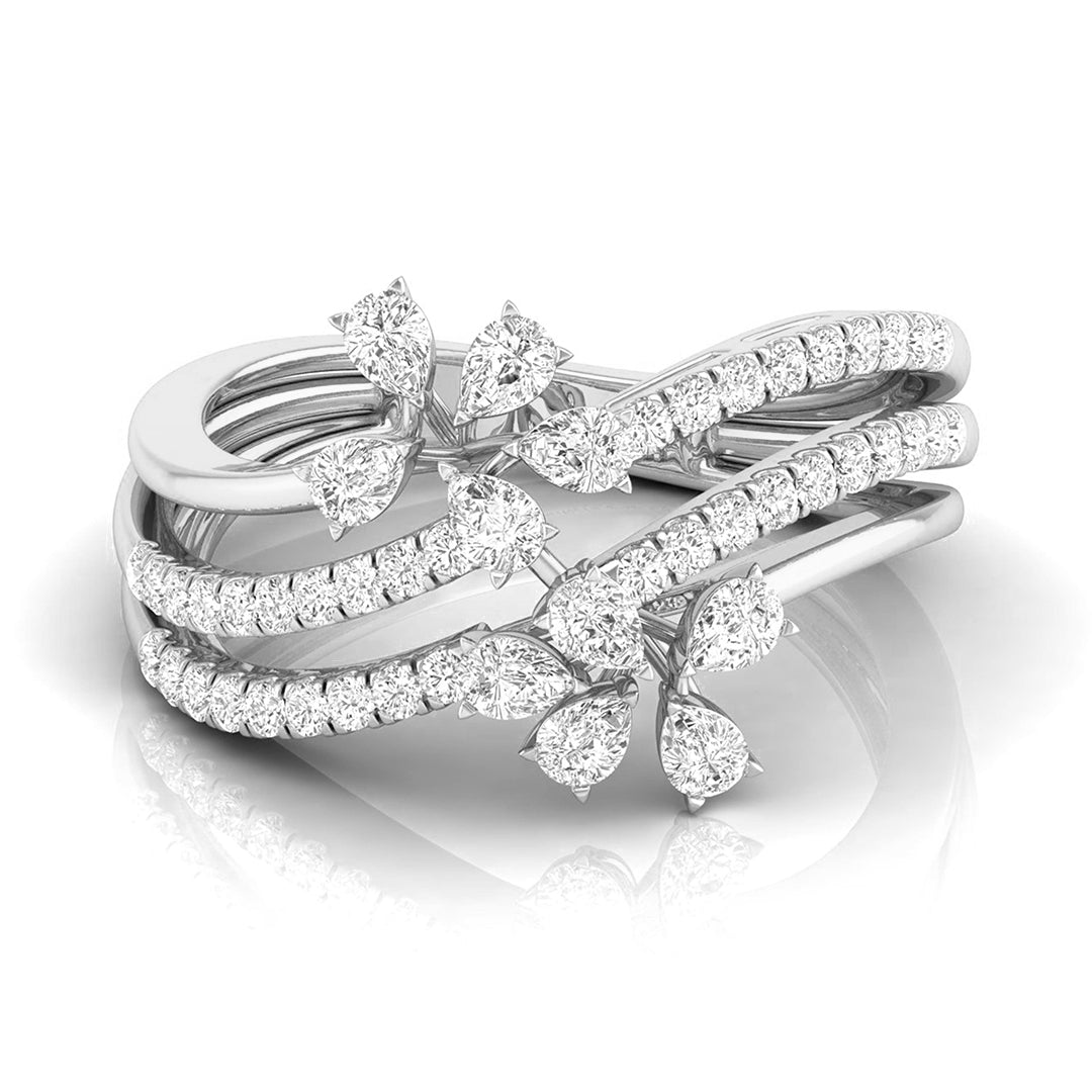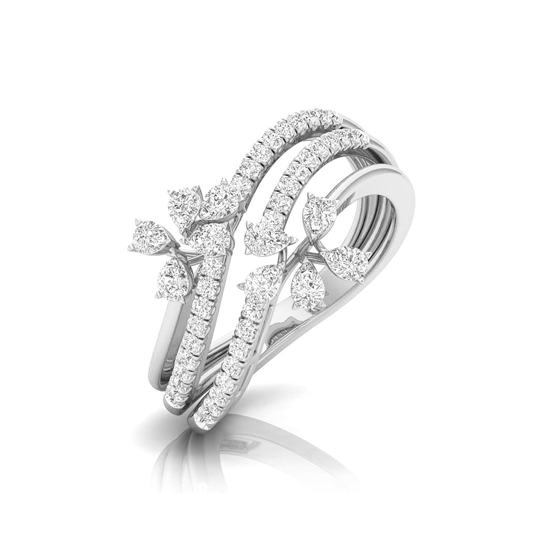 This enchanting ring showcases a captivating vine design, with three intricately layered bands adorned with sparkling diamonds. Each band intertwines gracefully, leading to delicate pear-shaped diamond blossoms that evoke the beauty of nature in full bloom. The flowing arrangement of diamonds adds dimension and movement to the ring, making it a stunning statement piece. Perfect for those who appreciate elegance with a touch of nature’s inspiration, this ring is ideal for both everyday wear and special occasions, offering a unique blend of sophistication and organic charm.