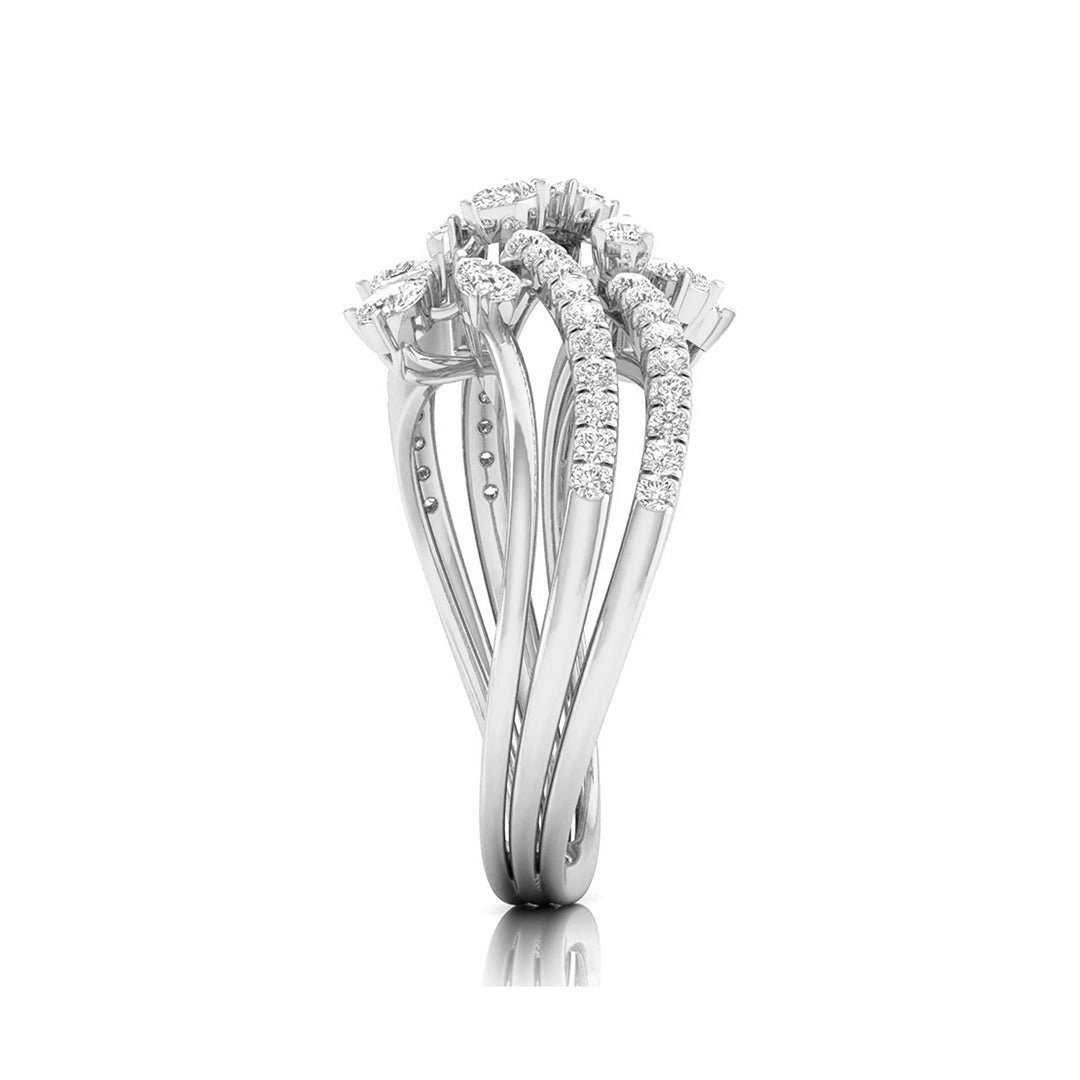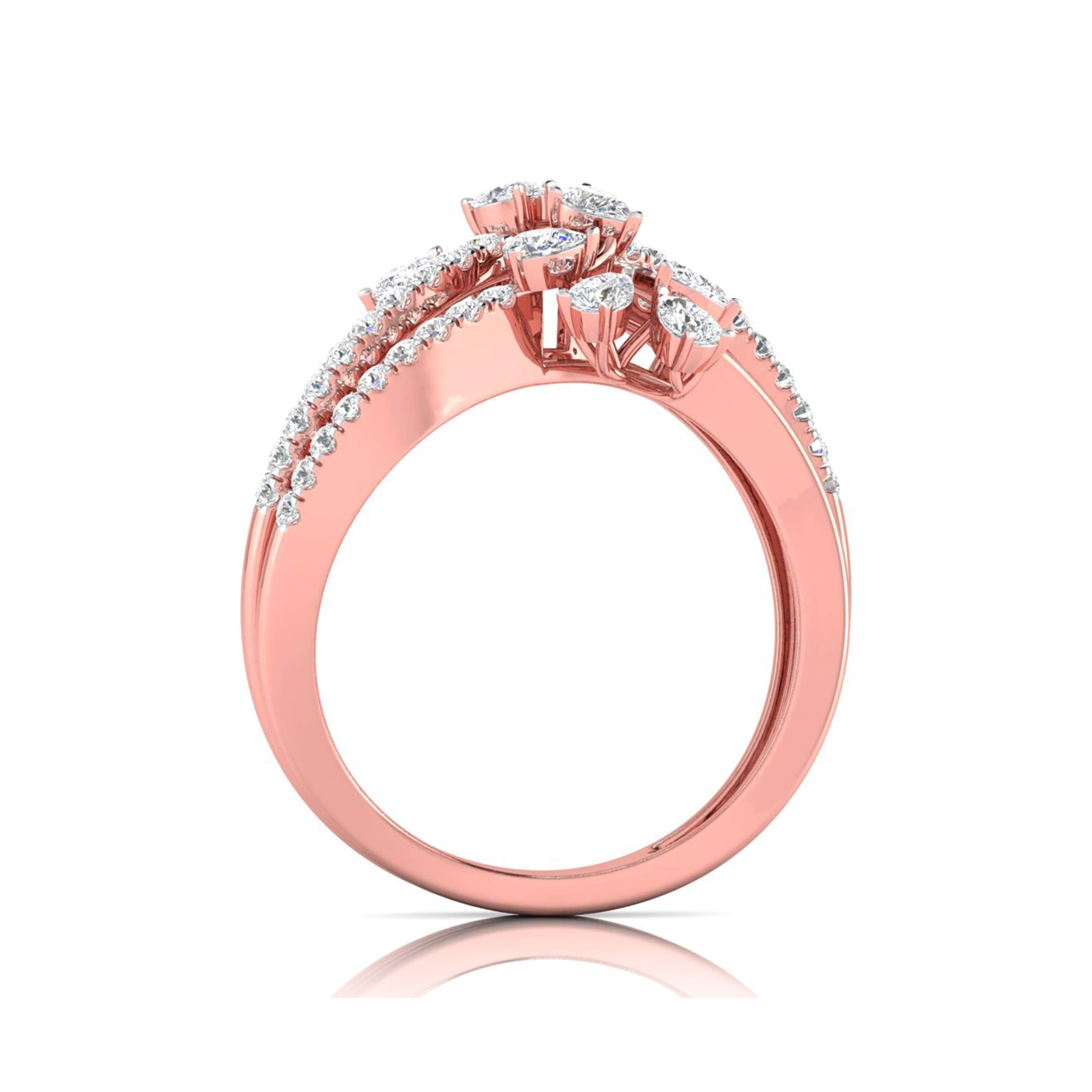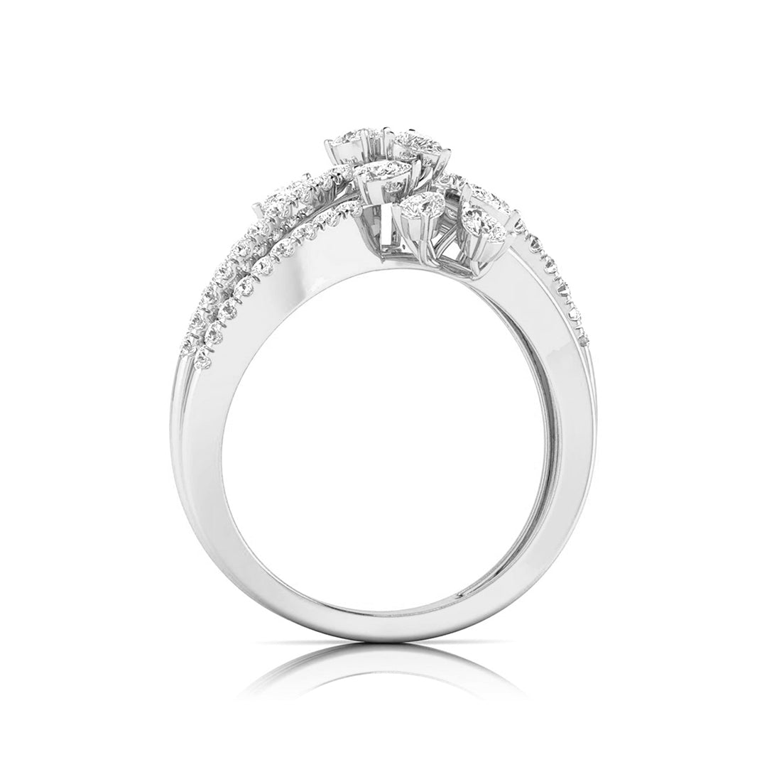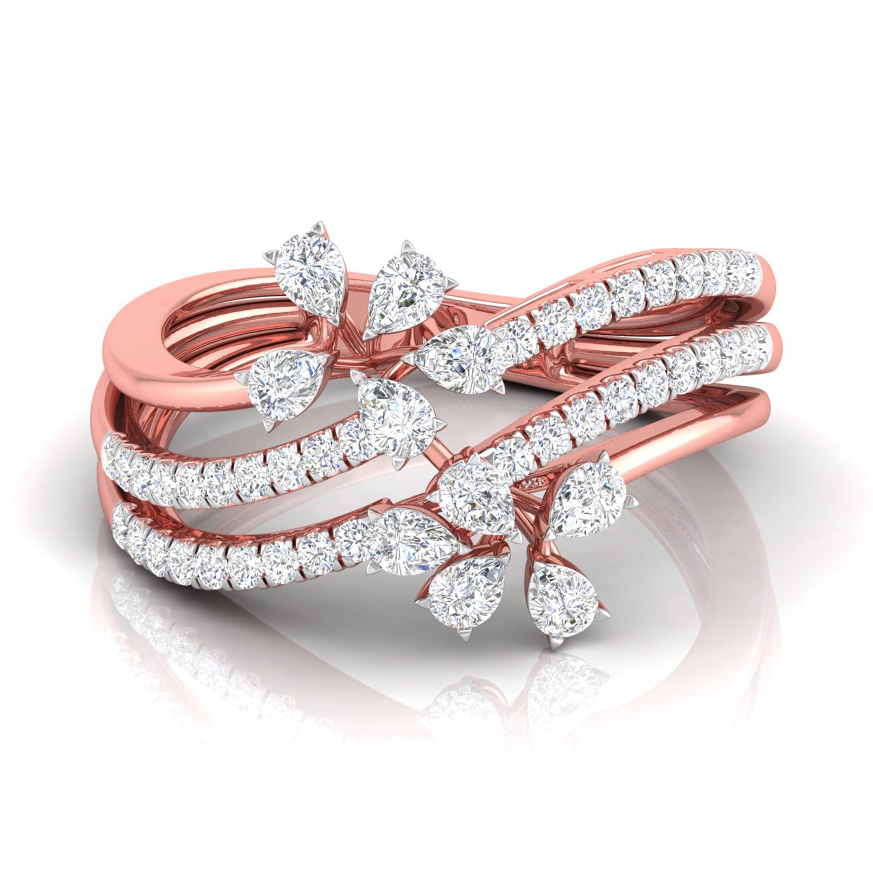 This enchanting ring showcases a captivating vine design, with three intricately layered bands adorned with sparkling diamonds. Each band intertwines gracefully, leading to delicate pear-shaped diamond blossoms that evoke the beauty of nature in full bloom. The flowing arrangement of diamonds adds dimension and movement to the ring, making it a stunning statement piece. Perfect for those who appreciate elegance with a touch of nature’s inspiration, this ring is ideal for both everyday wear and special occasions, offering a unique blend of sophistication and organic charm.