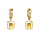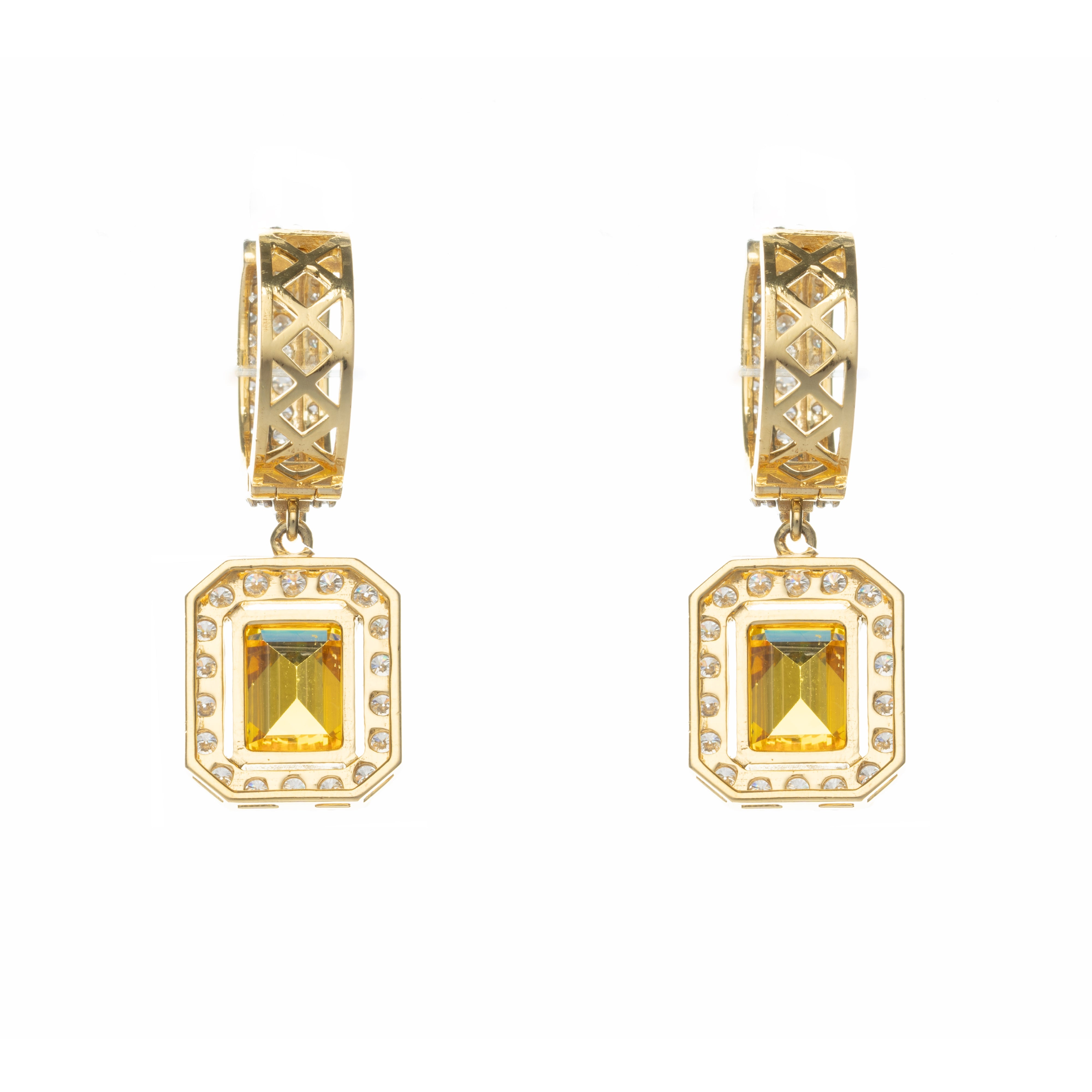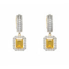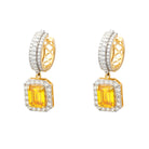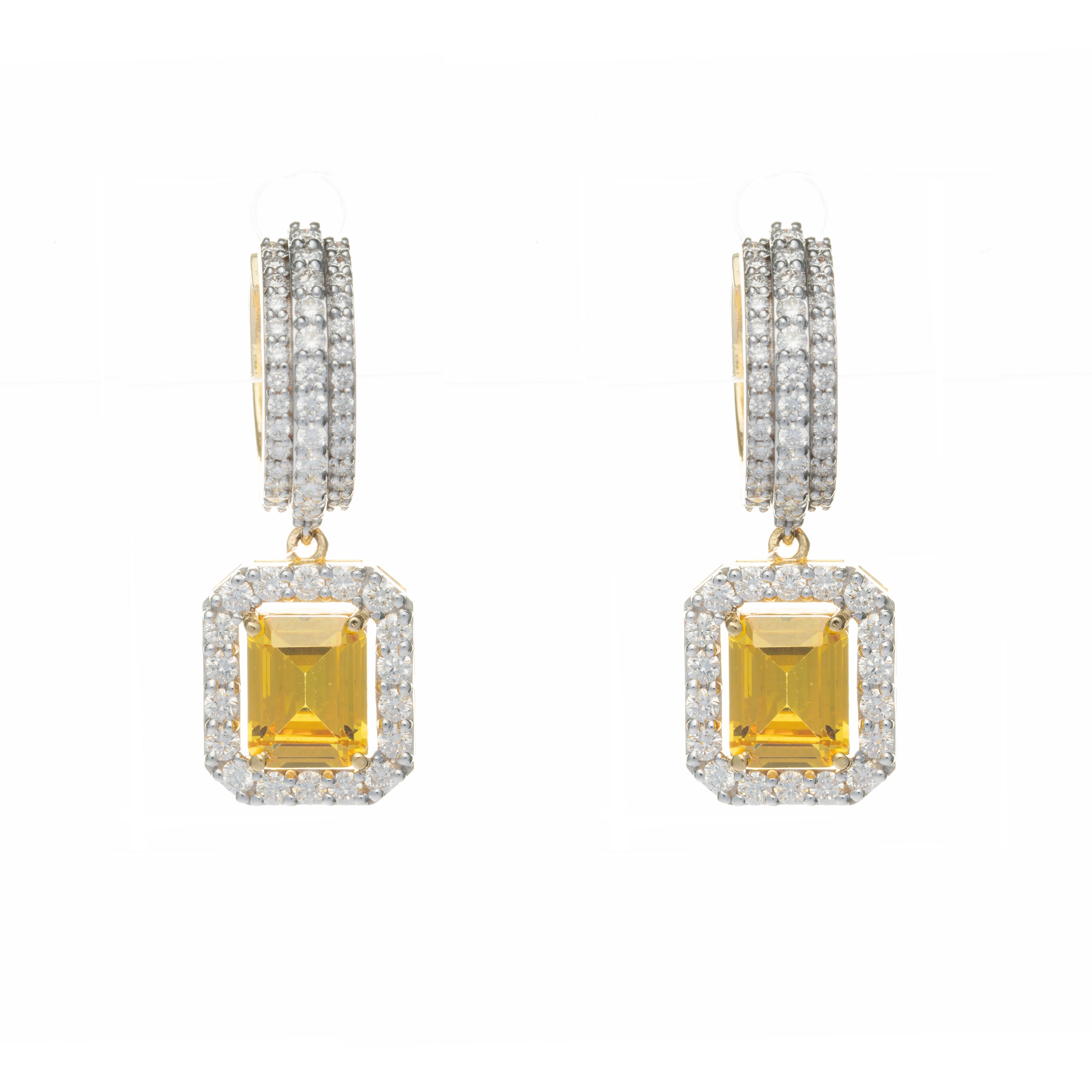 Elevate your elegance with these captivating drop earrings, featuring a prominent emerald-cut gemstone framed by a sparkling halo. The intricate hoop design, adorned with multiple rows of shimmering accents, adds a luxurious touch. These earrings exude sophistication and charm, making them an ideal choice for special occasions or to bring a touch of glamour to any ensemble.