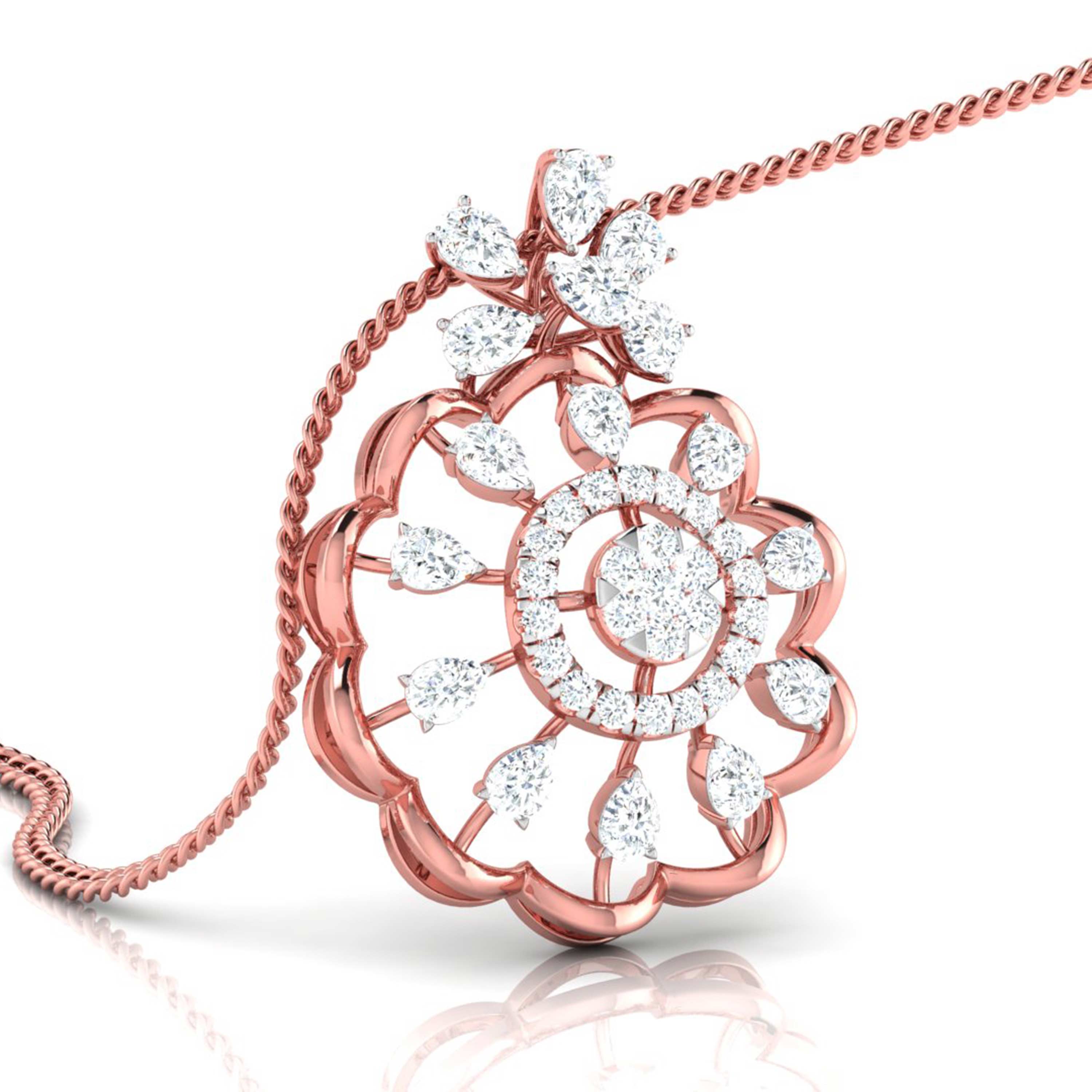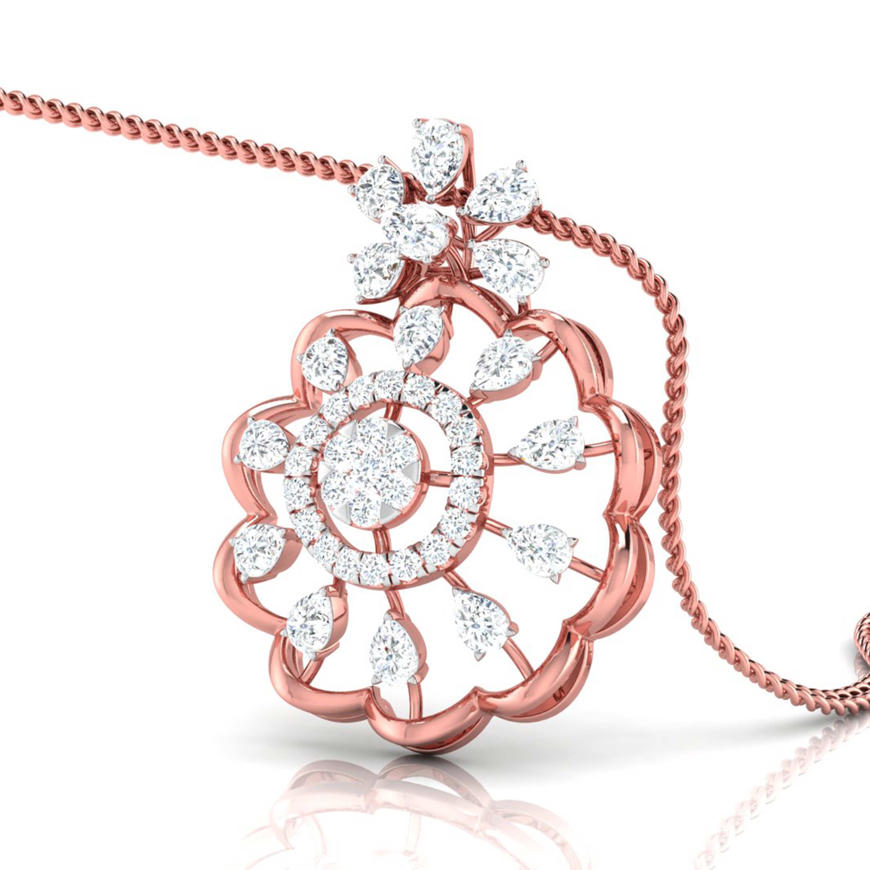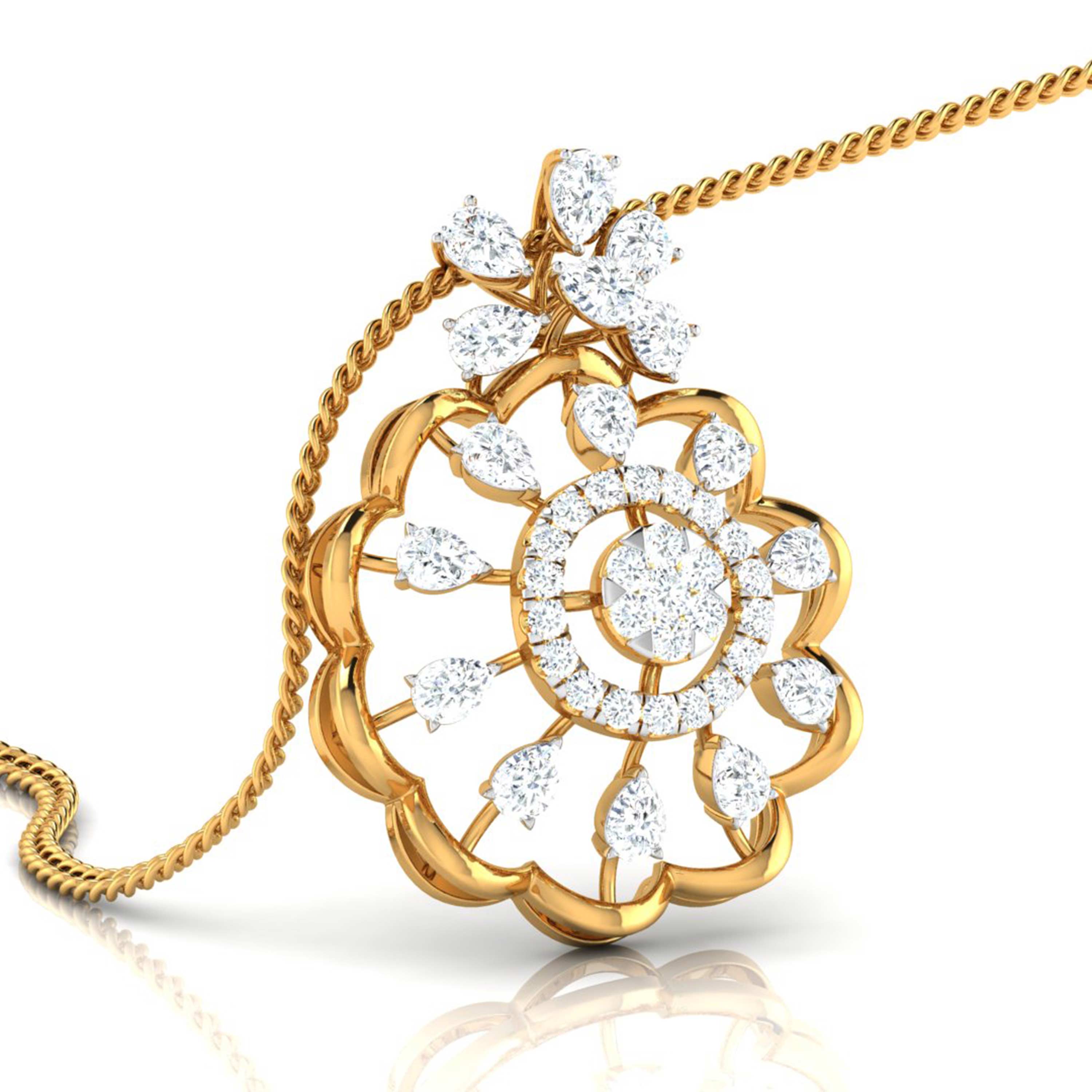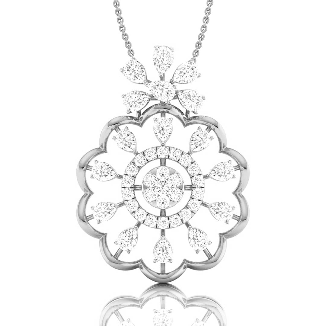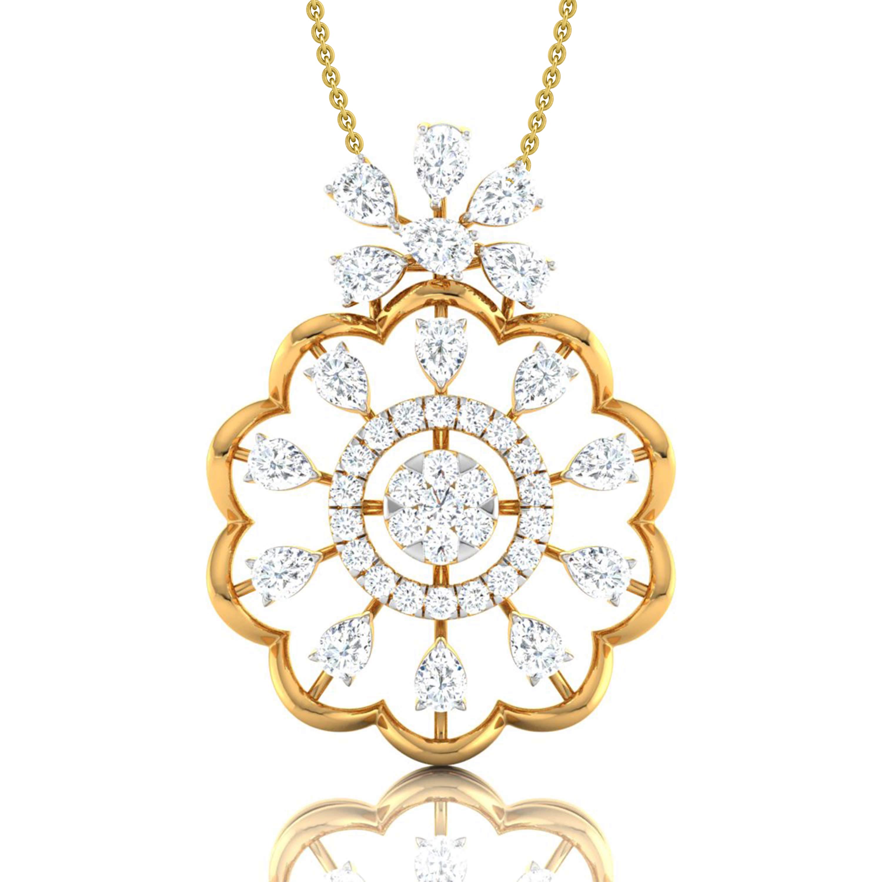 This enchanting pendant set is inspired by the delicate beauty of blooming flowers. The intricate design features a radiant cluster of pear-shaped diamonds, forming a graceful floral motif at the top, while the lower section showcases an elegant circular pattern encrusted with brilliant round diamonds. The layered flower-like design captures both elegance and nature’s charm, making it a perfect accessory for those who appreciate timeless sophistication. Ideal for elevating everyday outfits or enhancing your look for special occasions, this pendant set exudes refined luxury and artistic craftsmanship.