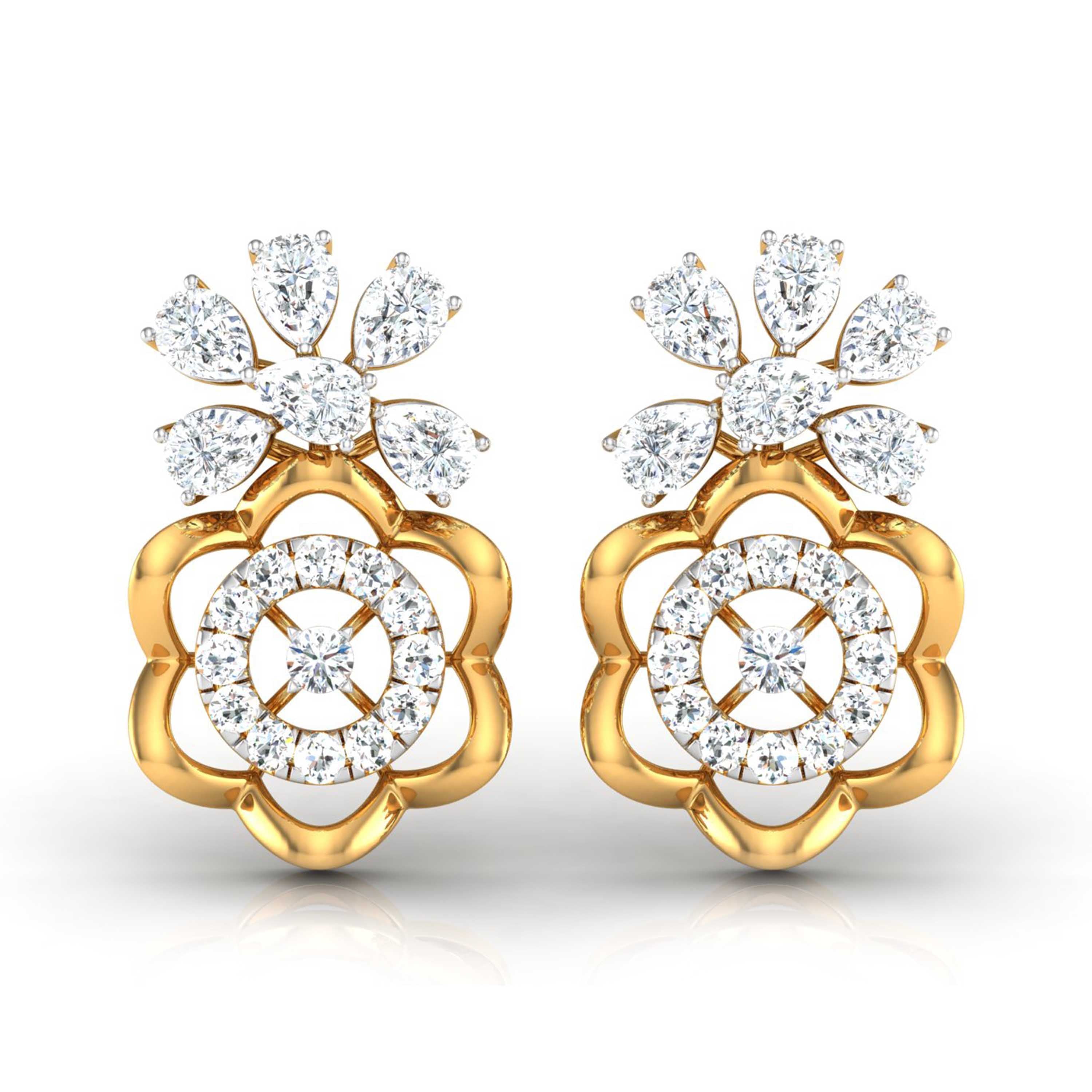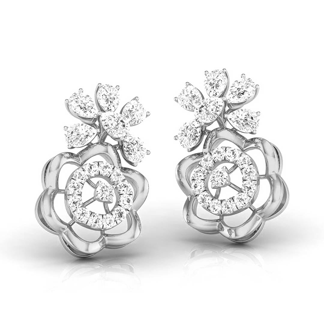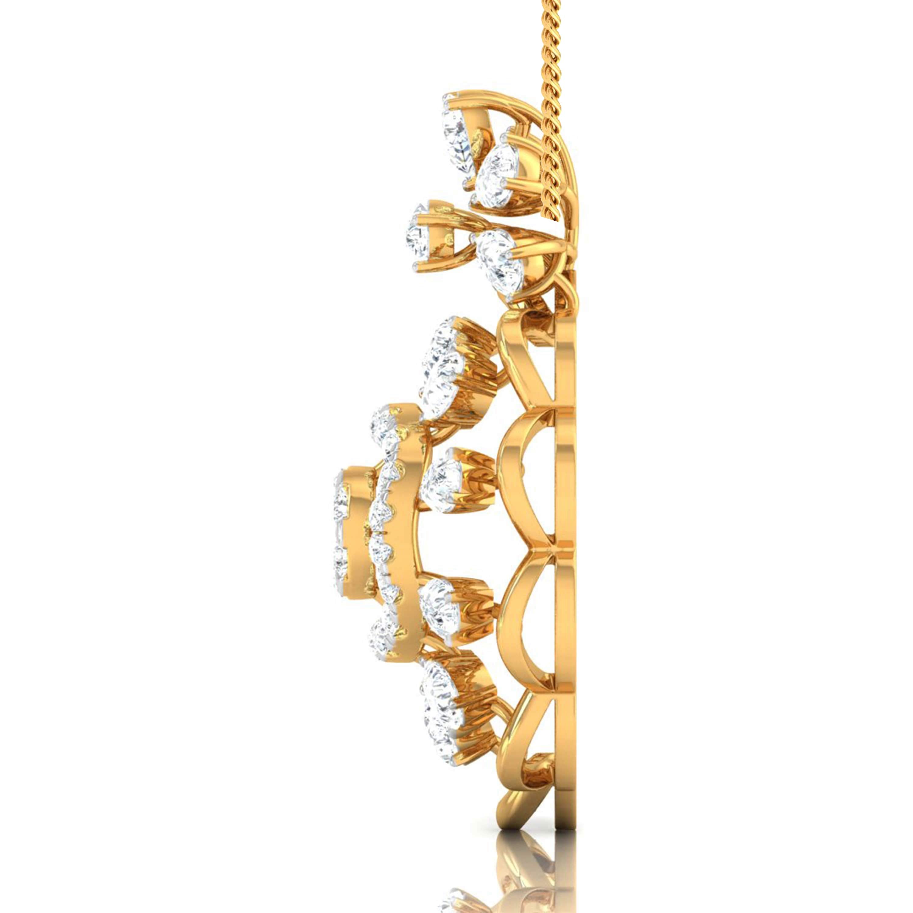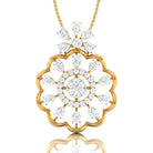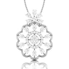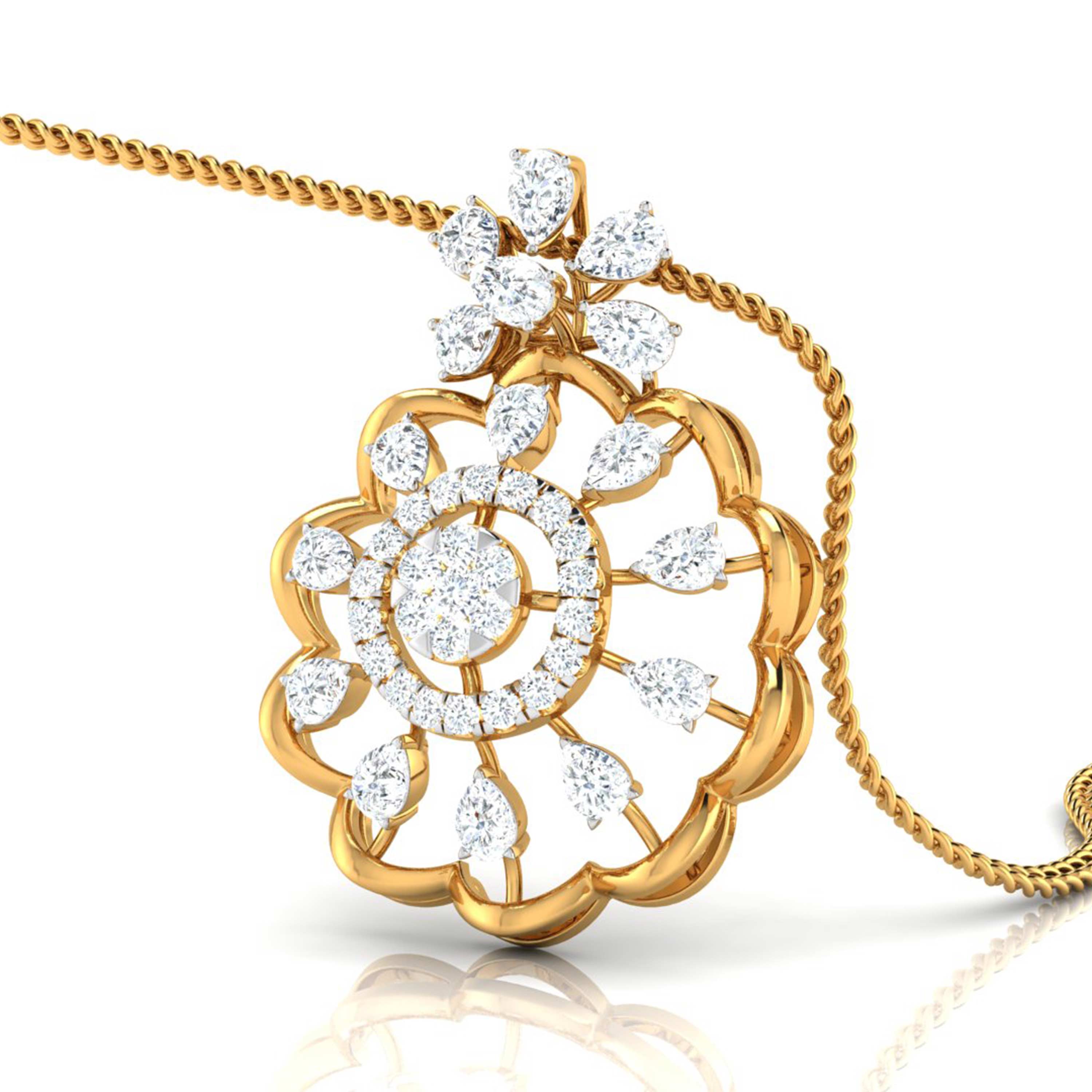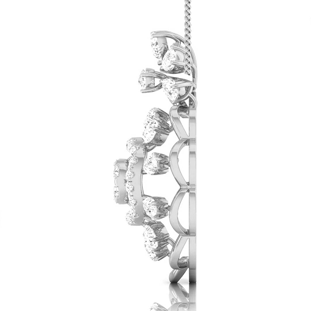 This enchanting pendant set is inspired by the delicate beauty of blooming flowers. The intricate design features a radiant cluster of pear-shaped diamonds, forming a graceful floral motif at the top, while the lower section showcases an elegant circular pattern encrusted with brilliant round diamonds. The layered flower-like design captures both elegance and nature’s charm, making it a perfect accessory for those who appreciate timeless sophistication. Ideal for elevating everyday outfits or enhancing your look for special occasions, this pendant set exudes refined luxury and artistic craftsmanship.