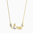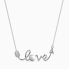 This whimsical necklace combines elegance with playful charm, featuring the word "love" beautifully scripted in a flowing design. Accented by an arrow on each side, symbolizing Cupid’s touch, and a single smooth pearl at the center, it represents a timeless message of affection. The finely detailed arrow tips add a sparkling touch, enhancing the overall allure of the piece. Perfect for expressing love and devotion, this necklace is an ideal gift or personal keepsake, seamlessly blending modern elegance with romantic symbolism.