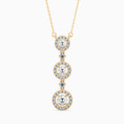 This captivating pendant features a trio of round-cut stones, each encircled by a shimmering halo of smaller stones, creating a mesmerizing cascade effect. The three-tiered design adds depth and elegance, with each halo amplifying the brilliance of the central stones. The delicate detailing between each layer enhances the overall sophistication, making this piece a perfect choice for formal occasions or adding a touch of glamour to everyday wear. A stunning symbol of grace and luxury, this pendant is designed to turn heads with its radiant beauty.
