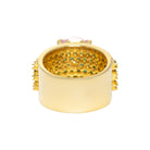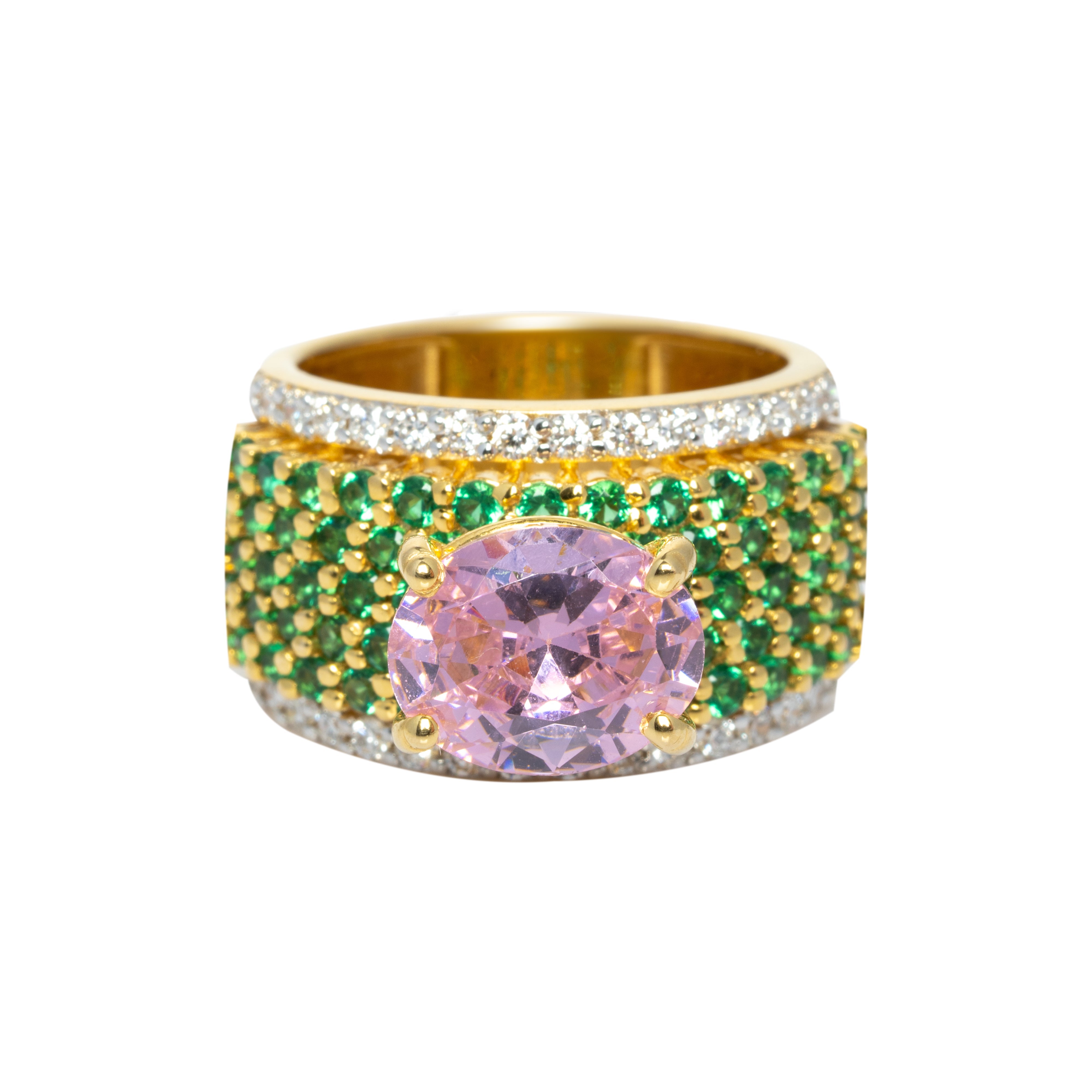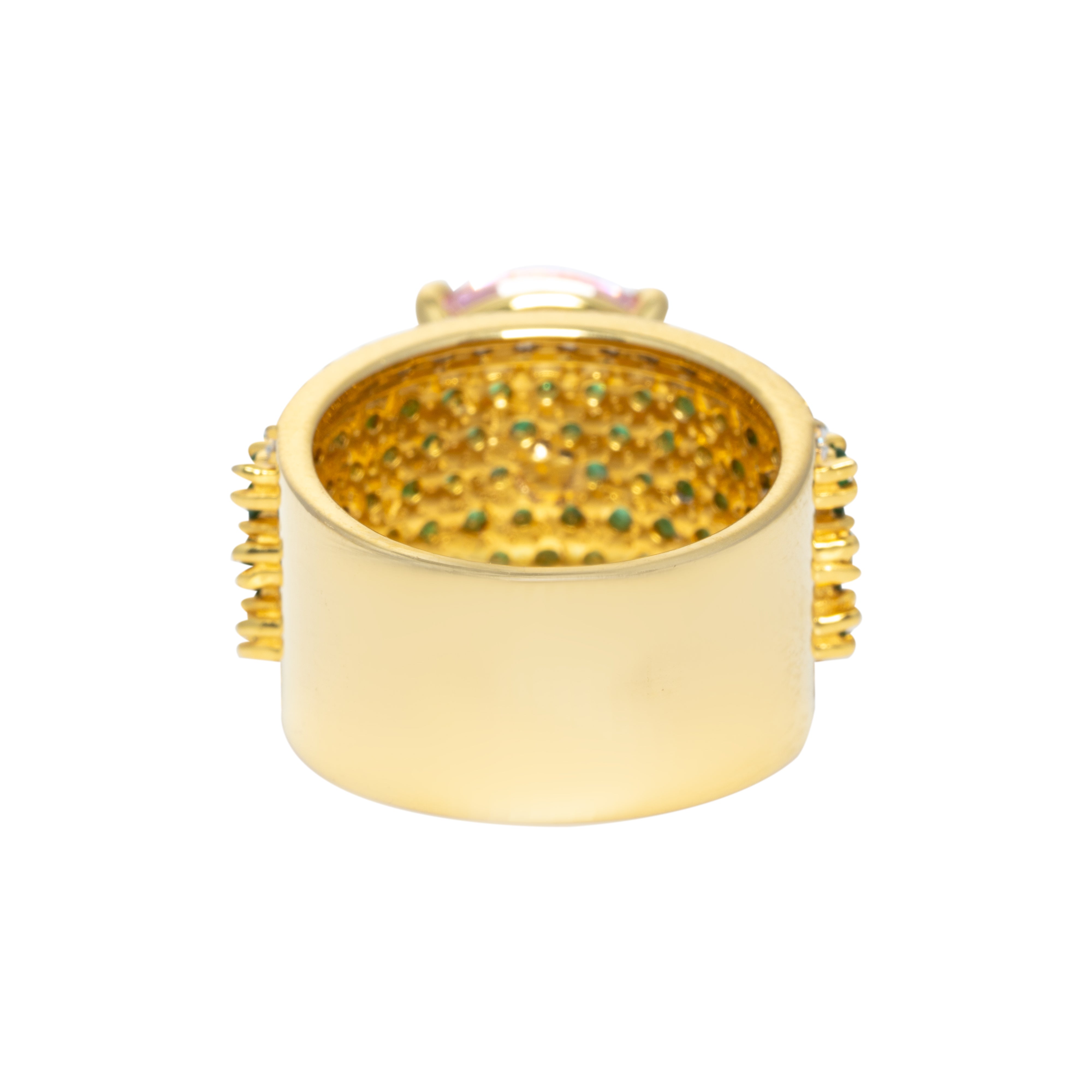 Elevate your style with this bold and luxurious statement ring. Featuring a radiant central gemstone surrounded by intricate detailing of vibrant, sparkling stones, this piece is a true work of art. Perfect for special occasions, this ring promises to add a touch of opulence and charm to any look, showcasing your flair for unique and eye-catching jewelry.